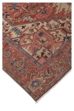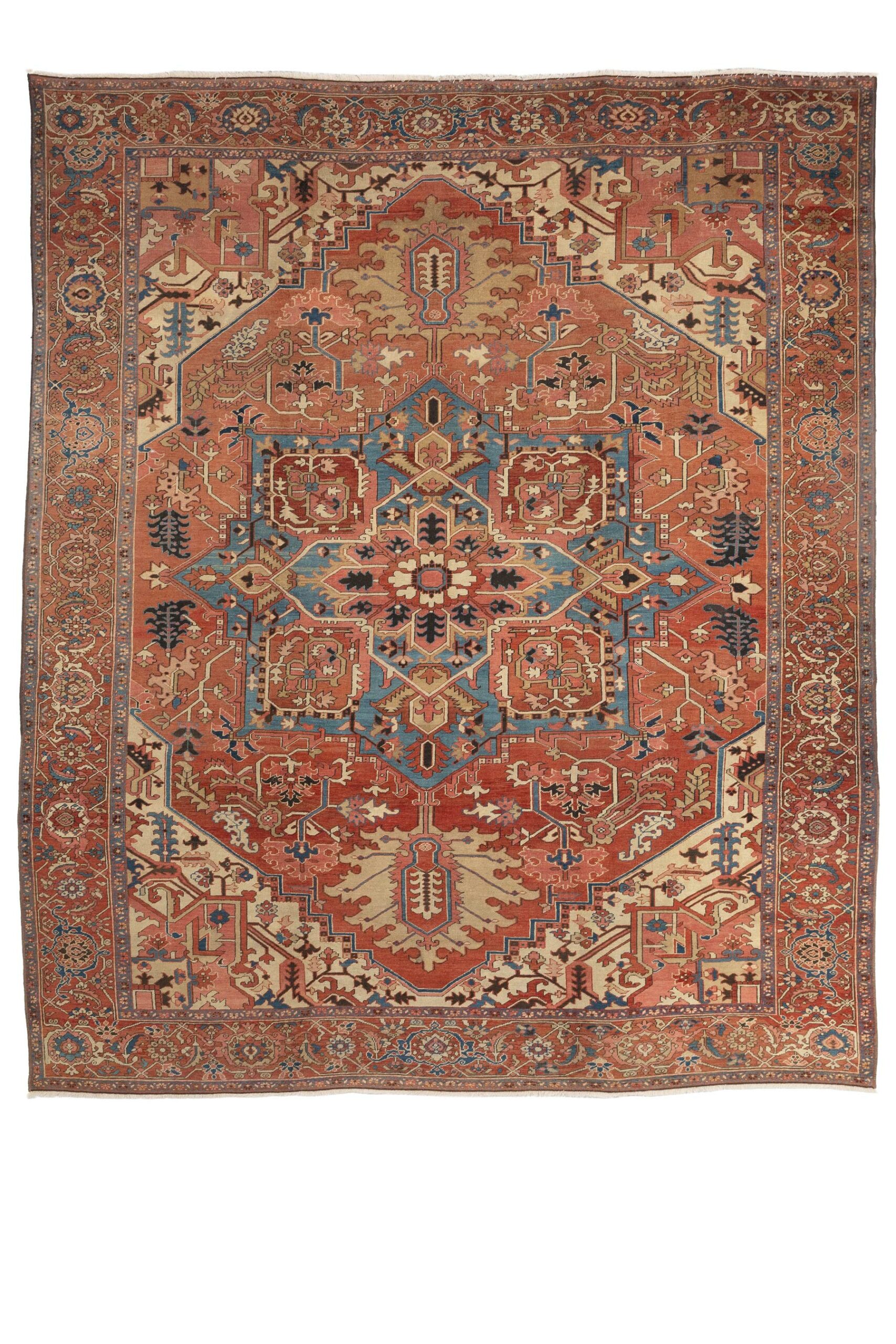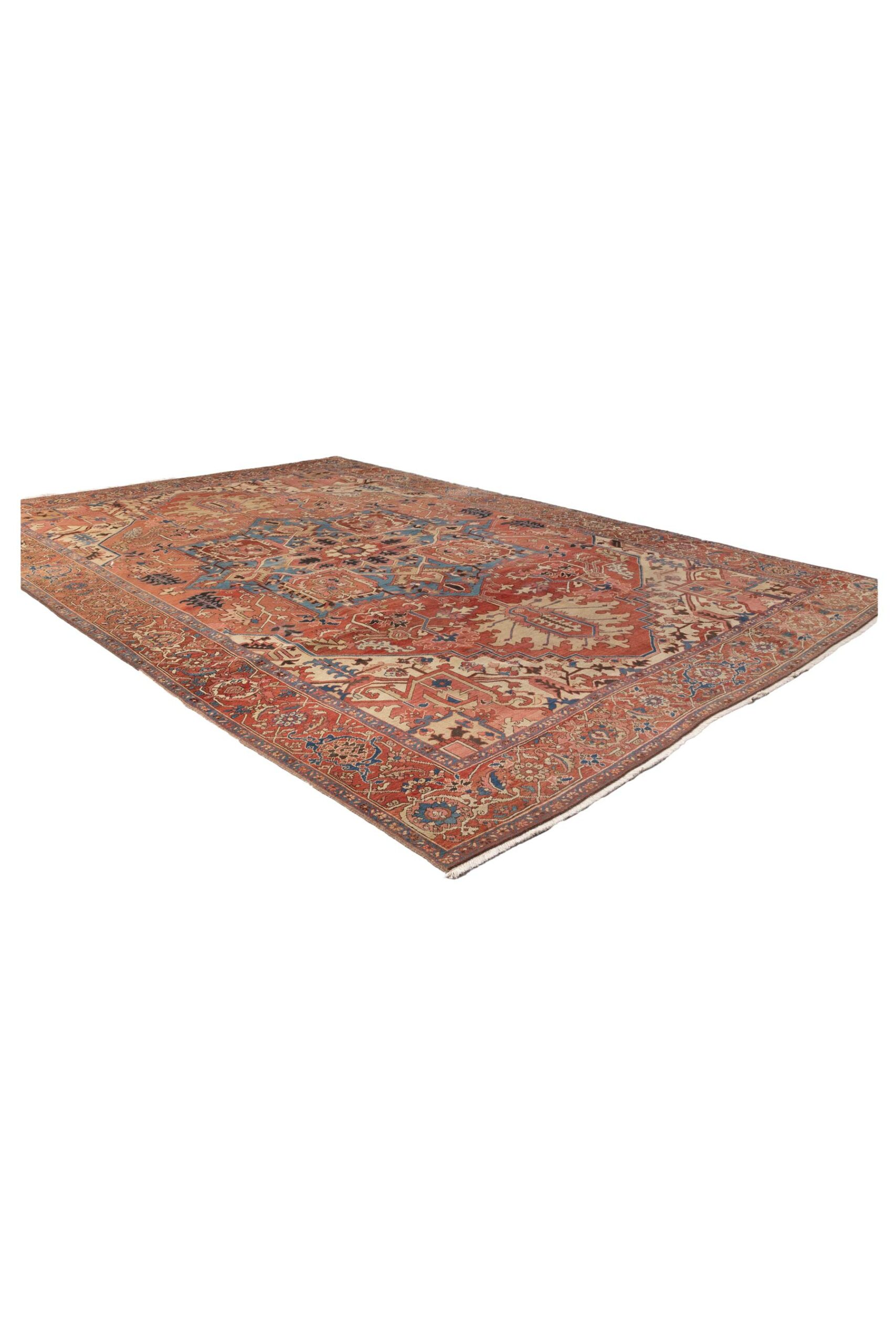 An antique Heriz Serapi carpet with a bold geometric medallion in soft terracotta, ivory, and faded blue tones. A timeless piece that reflects the character and rich heritage of Persian village weaving.