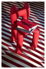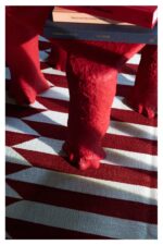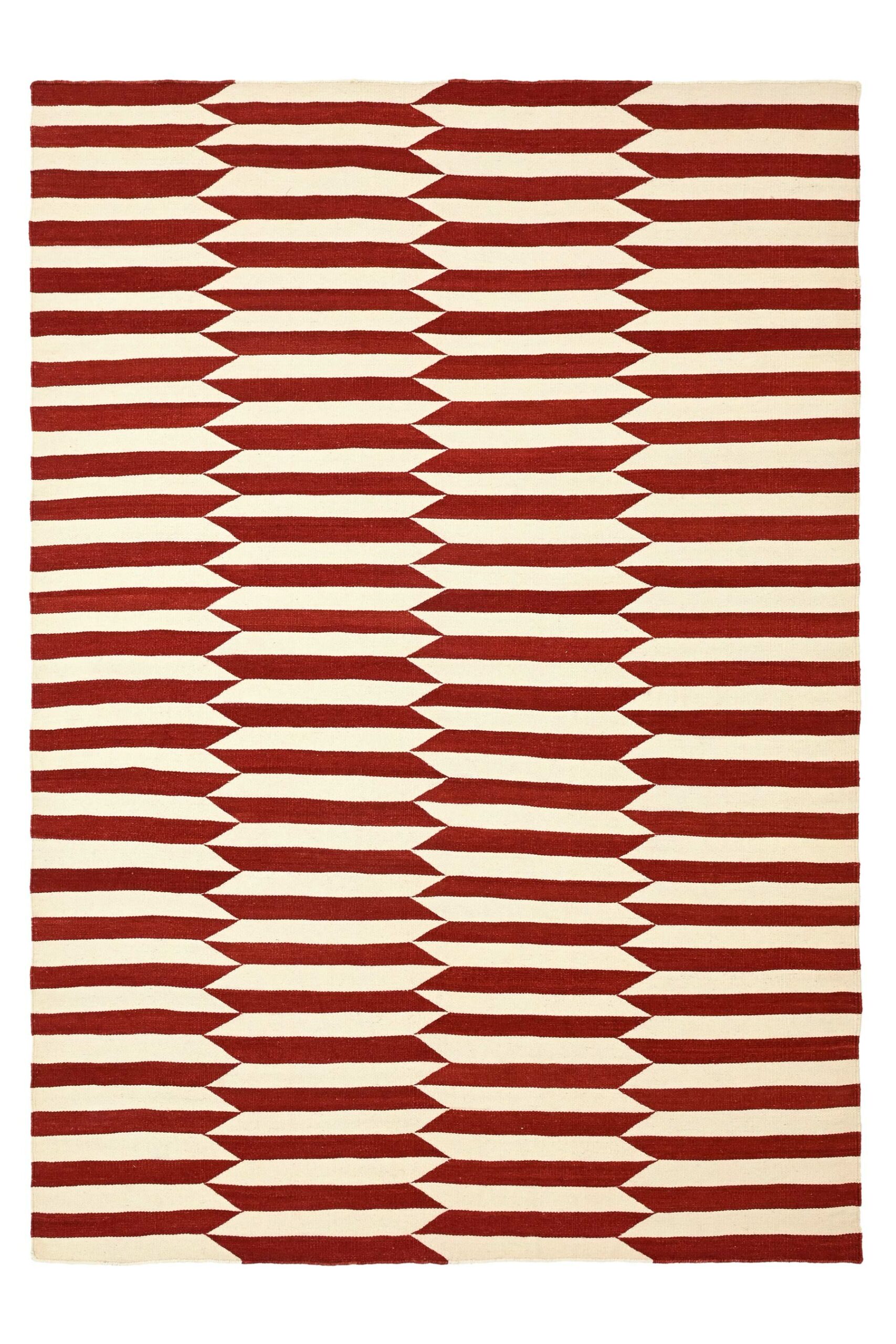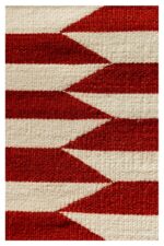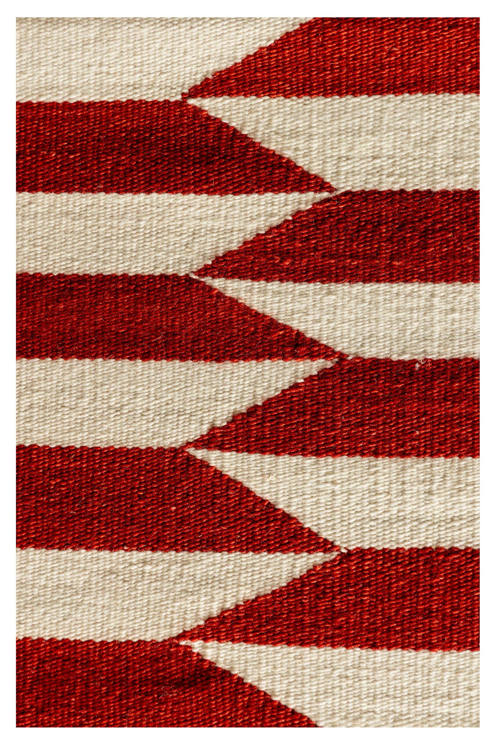 A modern kilim with bold geometry and precise design. Deep red and off-white stripes converge at sharp angles, creating a compelling optical effect. Graphic yet balanced, this handwoven carpet transforms space with its structured pattern and clean contrasts.