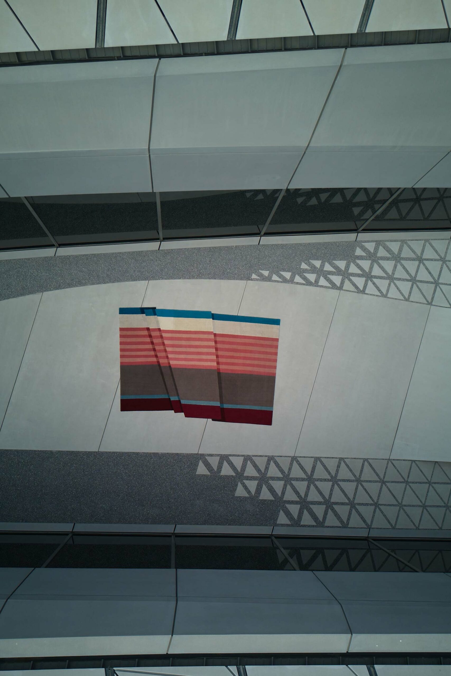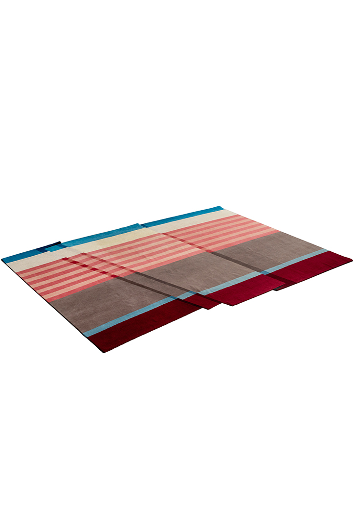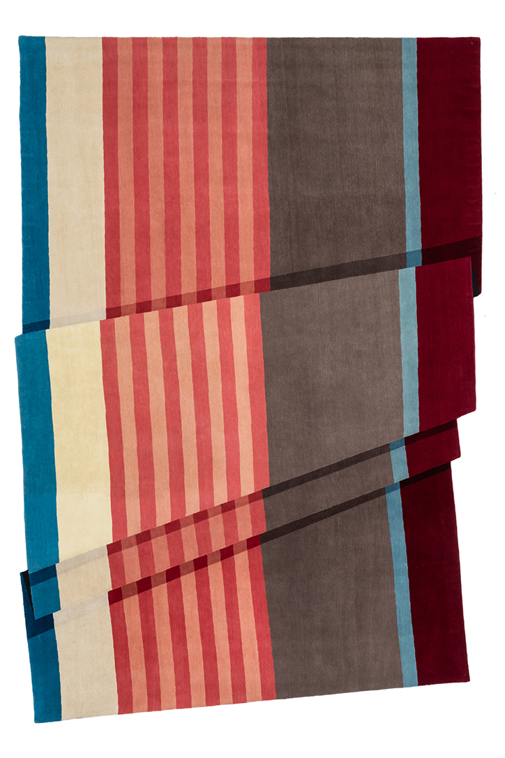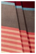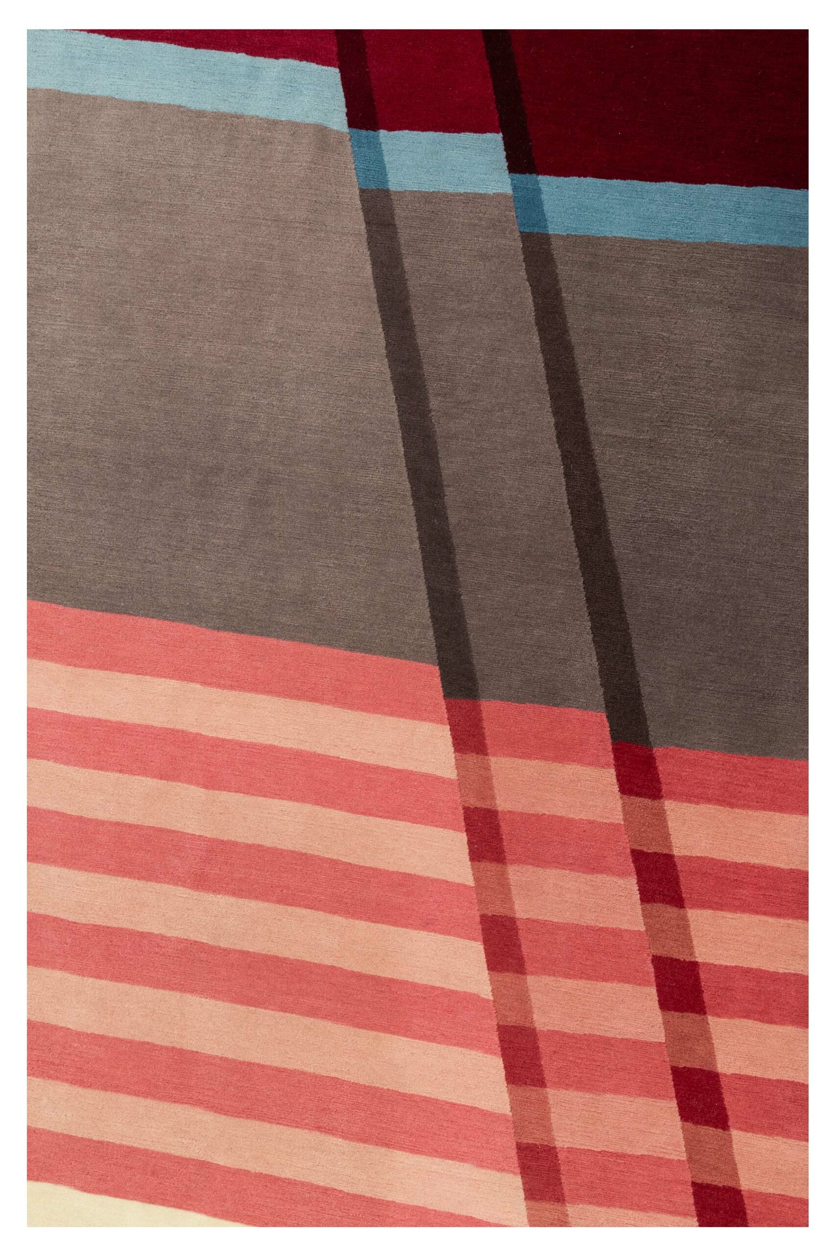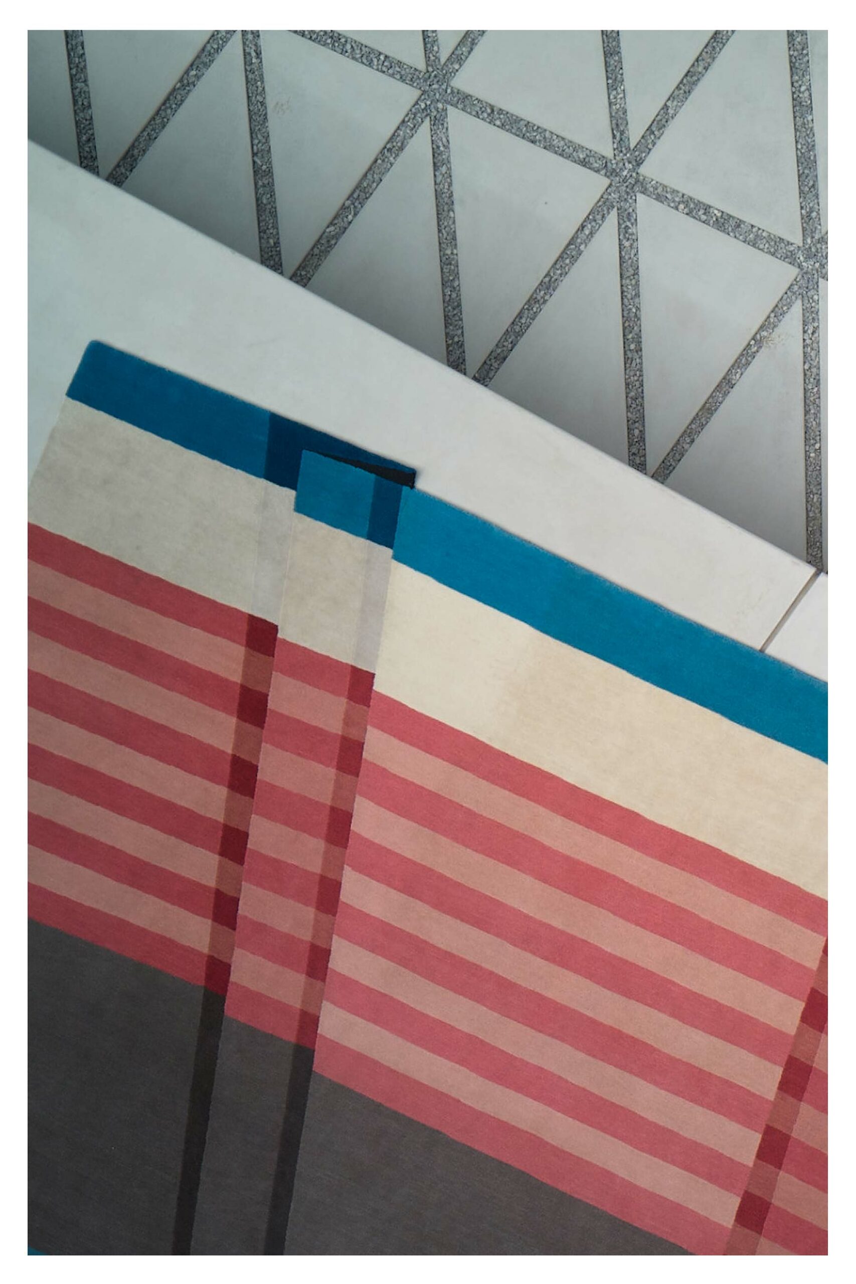 The Fold carpet features bold, geometric patterns with warm earthy tones, including deep reds, muted grays, soft creams, and accents of blue. Inspired by modernist design, its vibrant palette and clean composition create a captivating visual statement, perfect for contemporary interiors seeking artistic refinement.