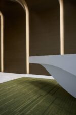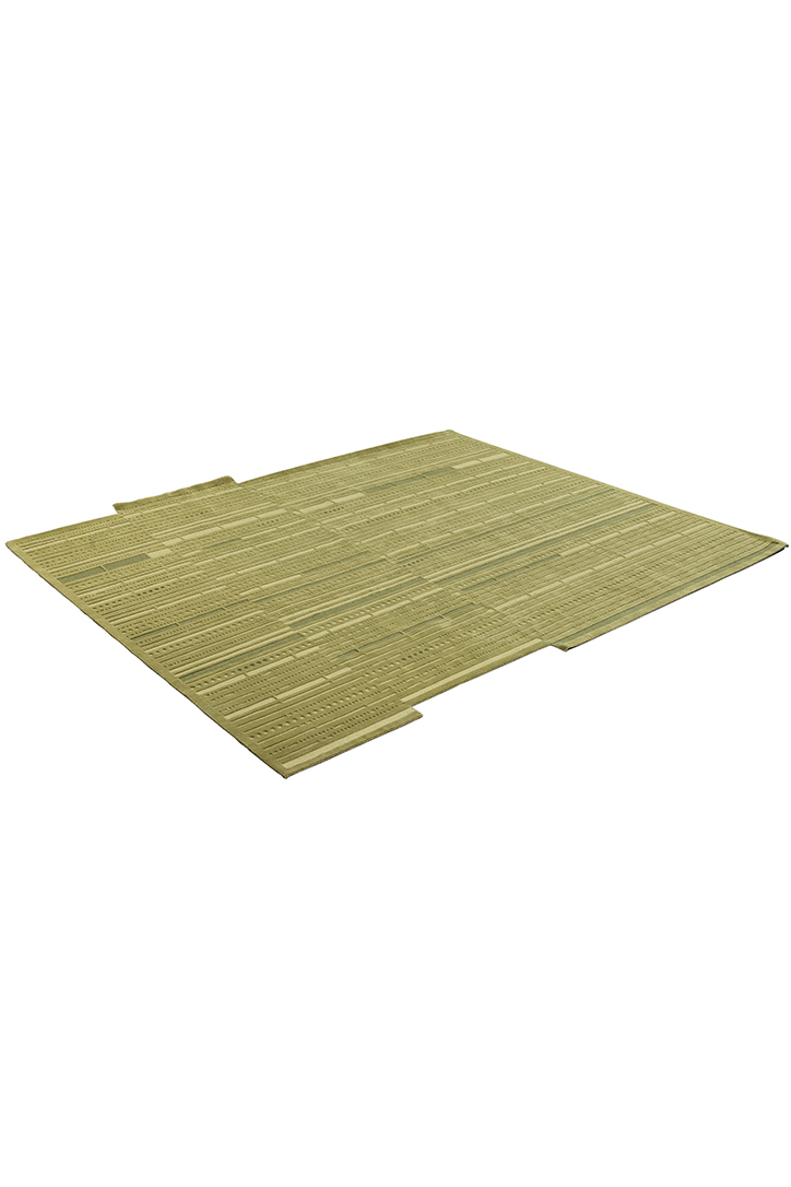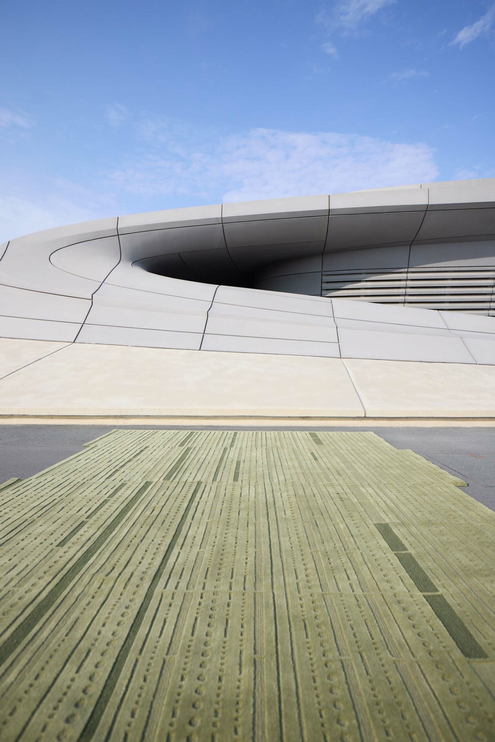 The Blip rug embodies the collection’s concept of structured rhythm and disruption. Featuring a green knitted texture with vertical lines, and dots, it reflects the balance between order and interruption. Inspired by the grid as a foundation for design, its repetitive patterns create a steady rhythm, subtly disrupted by volumetric shifts that add depth and movement.
