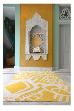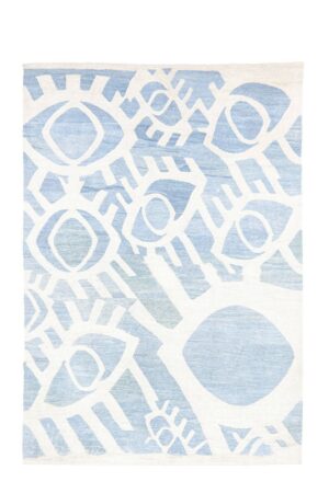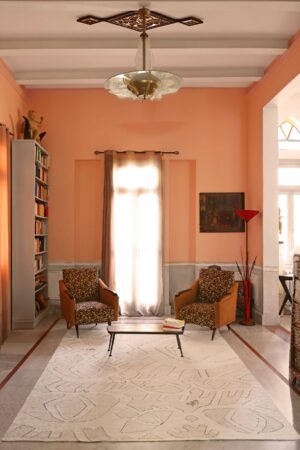 All Eyes is a tribute to the region’s heritage and Arab culture, rooted in collective memory and identity. inspired by the legend of the evil eye, Nadine Kanso hand-drew a bespoke "eye" as a symbol of protection, turning it into a signature of her brand, Bilarabi. Embracing contrast, she merges antique motifs with contemporary aesthetics, bringing the old and new together in a bespoke carpet by Iwan Maktabi.